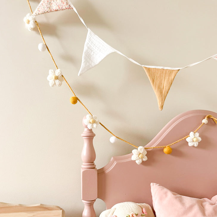 Introducing our beautifully hand crocheted and crafted by us, Daisy Garland. Our Daisy garland consists of 6 (a combination of small and bigger flowers) hand crocheted flowers in white, with wool pompom in the centre of each flower. Our Daisy garland is a mix of crocheted flowers with a wool pompom in between each flower. Mix and match with our Maeve Wall flowers or our Bunting for a complete look.